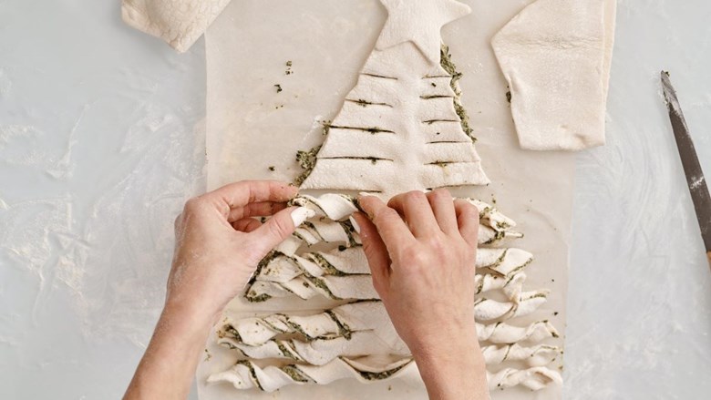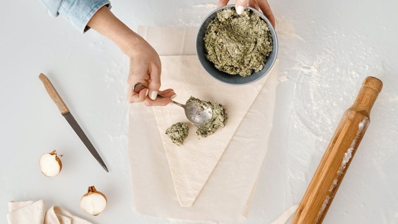 SASTOJCI: - 400g lisnato tijesto SLANO PUNJENJE: - 400g špinata - 1 češanj češnjaka - 1 mala glavica crvenog luka - 200g krem sira (ili svježeg sira) SLATKO PUNJENJE: - 100g čokoladnog namaza po izboru