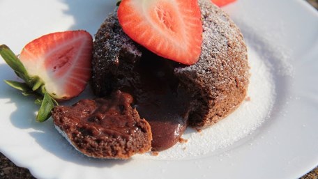 PRIPREMITE (ZA 4 OSO BE): ▶ 3 jaja ▶ 100 g šećera ▶ 100 g desertne čokolade ▶ 90 g maslaca ▶ 35 g bijelog brašna ▶ 1 žlica kakaa u prahu ▶ 1 žlica mlijeka