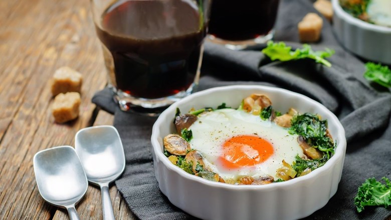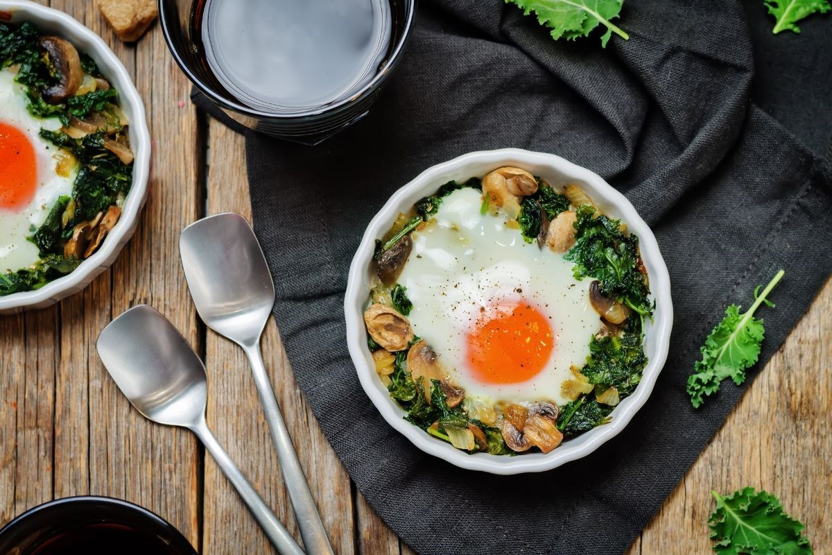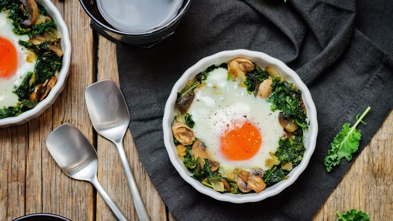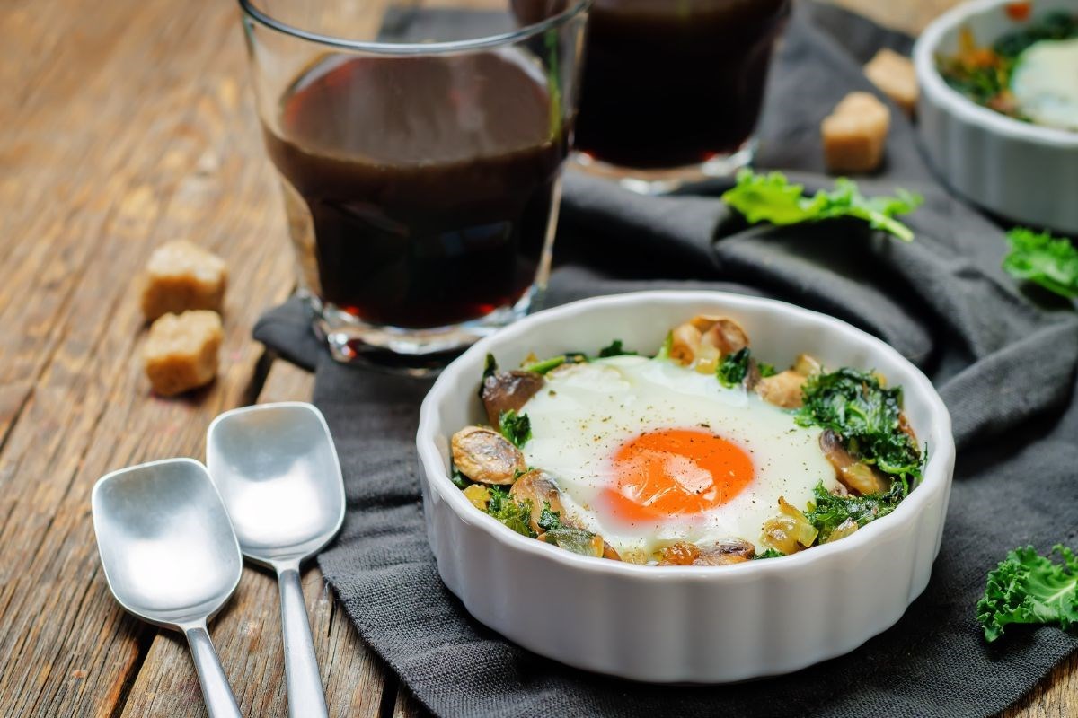 SASTOJCI: - oko 200g gljiva po izboru (najbolje šampinjoni) - 1 češanj češnjaka - 1 žlica maslinova ulja - 160g kelja - 4 jaja - sol - papar