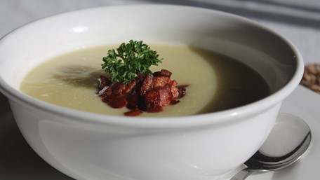 PRIPREMITE (ZA 4 DO 6 OSOBA): ▶ 25 g maslaca ▶ 3 ploške pancete ▶ 1 crveni luk ▶ 400 g poriluka ▶ 3 srednje velika krumpira ▶ 1,5 l povrtnog temeljca ▶ 150 ml vrhnja za kuhanje ▶ 4 ploške pancete za posluživanje ▶ sol