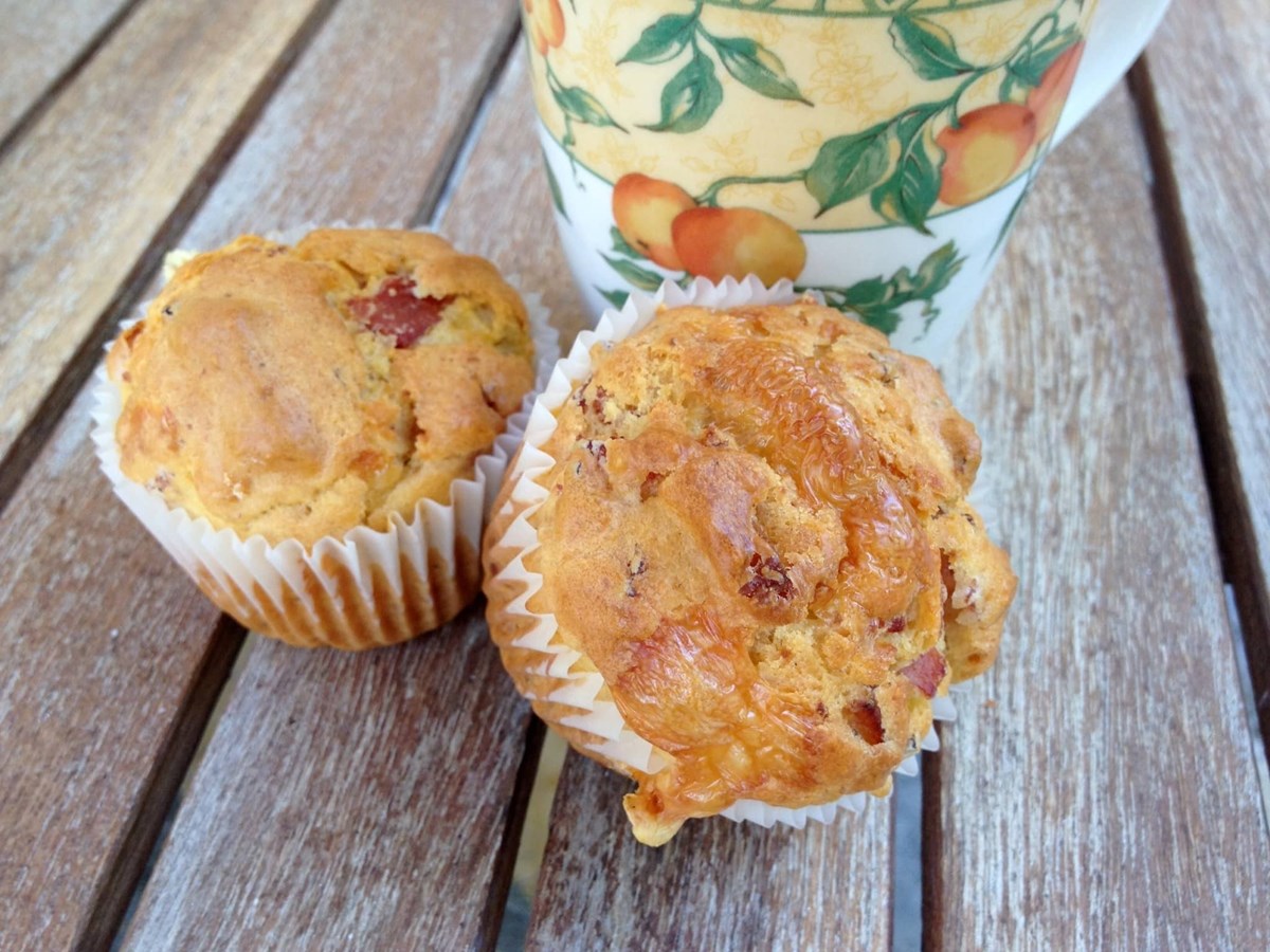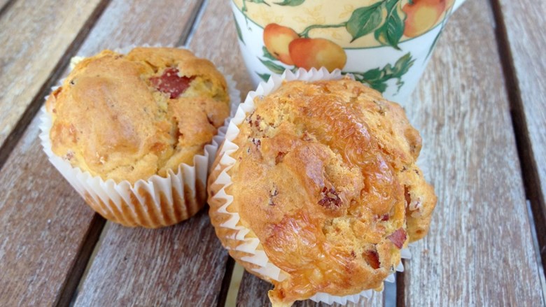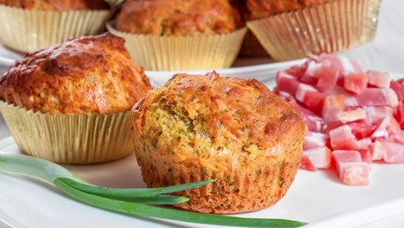 PRIPREMITE: ▶ 200 g glatkog brašna ▶ 200 g pirova brašna ▶ 100 g gaude (narezane na kockice) ▶ 100 g pršuta ▶ 1 jaje ▶ 100 g maslaca ▶ 150 ml mlijeka ▶ 200 ml kiselog vrhnja ▶ 200 ml jogurta ▶ 1 češanj češnjaka ▶ 2 žličice praška za pecivo ▶ ¼ žličice čilija ▶ papar ▶ košarice za muffine ▶ 1 vezica mladog luka