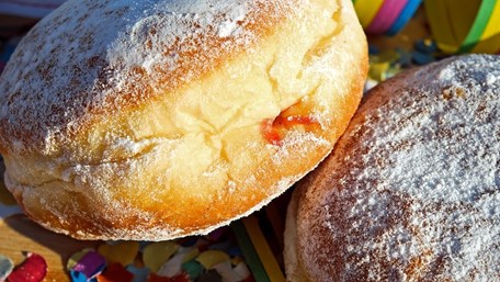 SASTOJCI (za 30 krafni): 2 jaja 3dl mlijeka 20g svježeg kvasca (može i u prahu) 100g margarina 3 žličice šećera 1 žličica soli naribana korica limuna malo ruma 600-700g brašna (dodaje se po potrebi) ulje za prženje šećer u prahu nadjev po želji (čokolada ili marmelada po izboru)