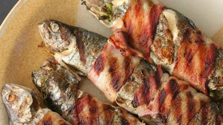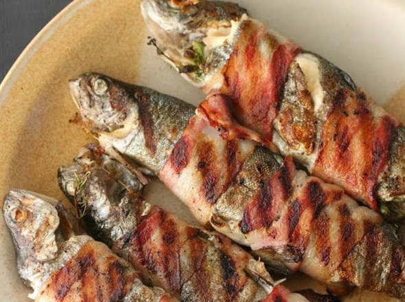 PRIPREMITE (ZA 4 OSOBE): ▶ 4 pastrve (svaka 25-30 dag) ▶ 8 češnjeva usitnjenog češnjaka ▶ jušna žlica maslinova ulja ▶ 8 ploški hamburške slanine ▶ žličica majčine dušice ▶ žličica ružmarina ▶ žličica kadulje