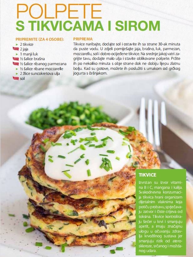 PRIPREMITE ( ZA 4 OSOBE): - 2 tikvice - 2 jaja - 1 manji luk - 70g brašna - 40g ribanog parmezana - 40g mozzarelle - 2 žlice suncokretova ulja - sol