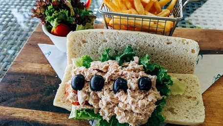 PRIPREMITE (ZA 4 OSOBE): ▶ 4 peciva po želji ▶ 1 konzerva tunjevine ▶ 1 vezica mladog luka ▶ 200 g svježeg sira ▶ 1 svježi krastavac ▶ 4 lista zelene salate po izboru ▶ sol ▶ papar