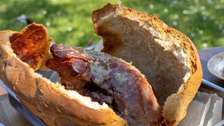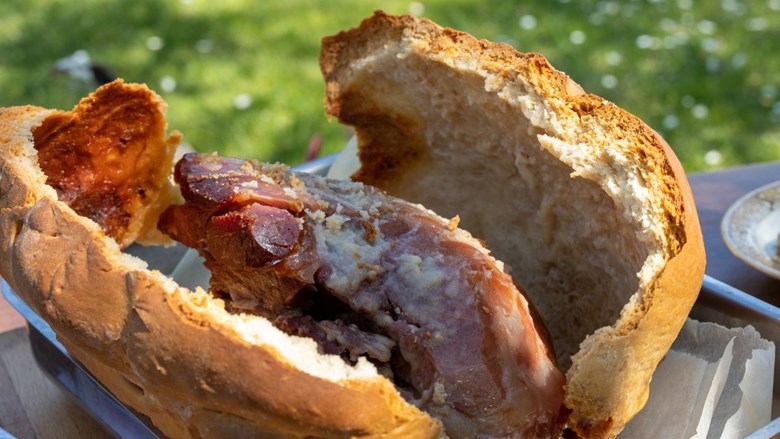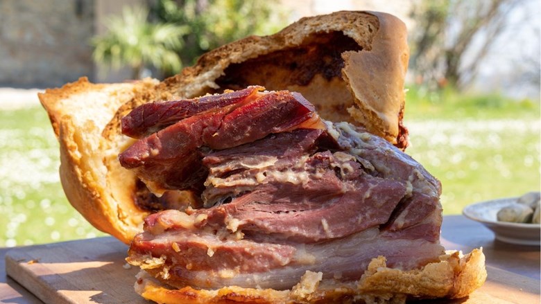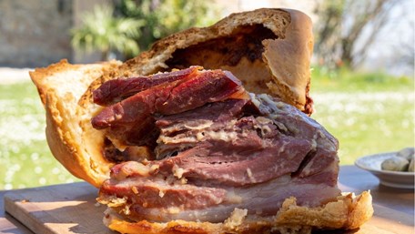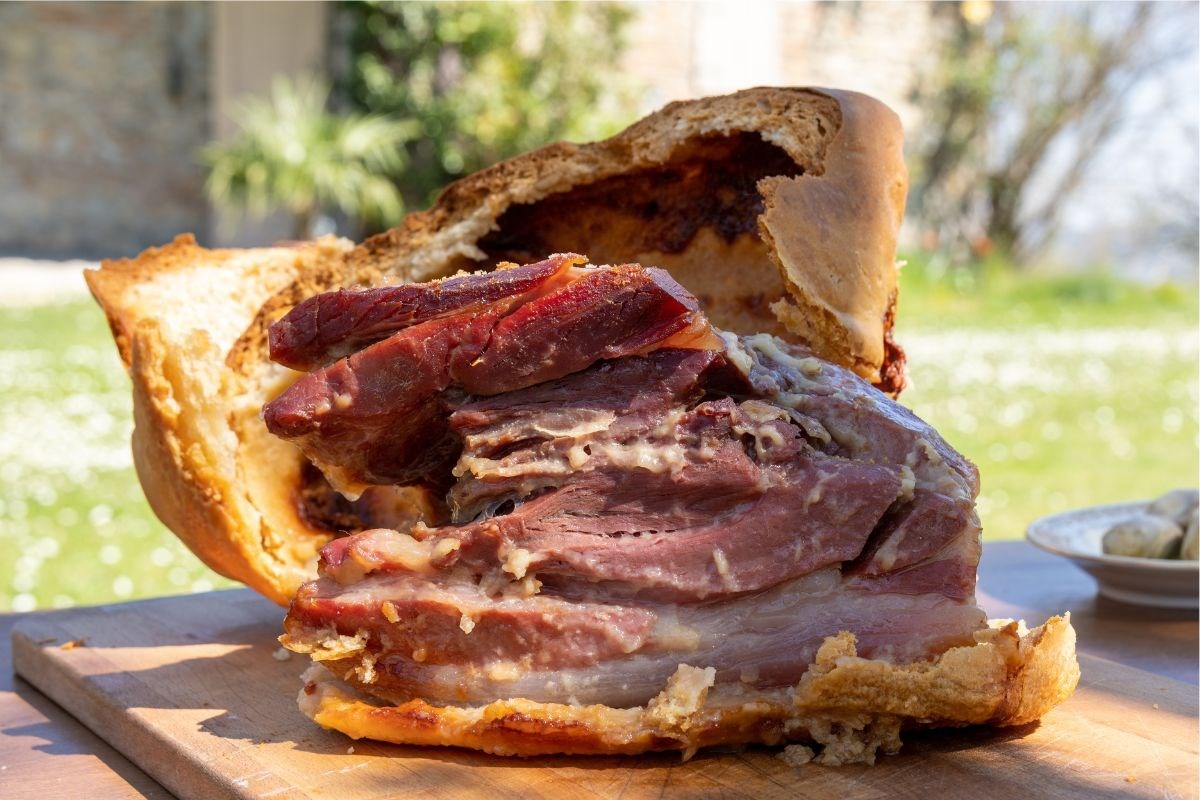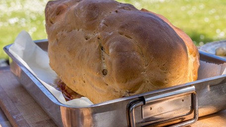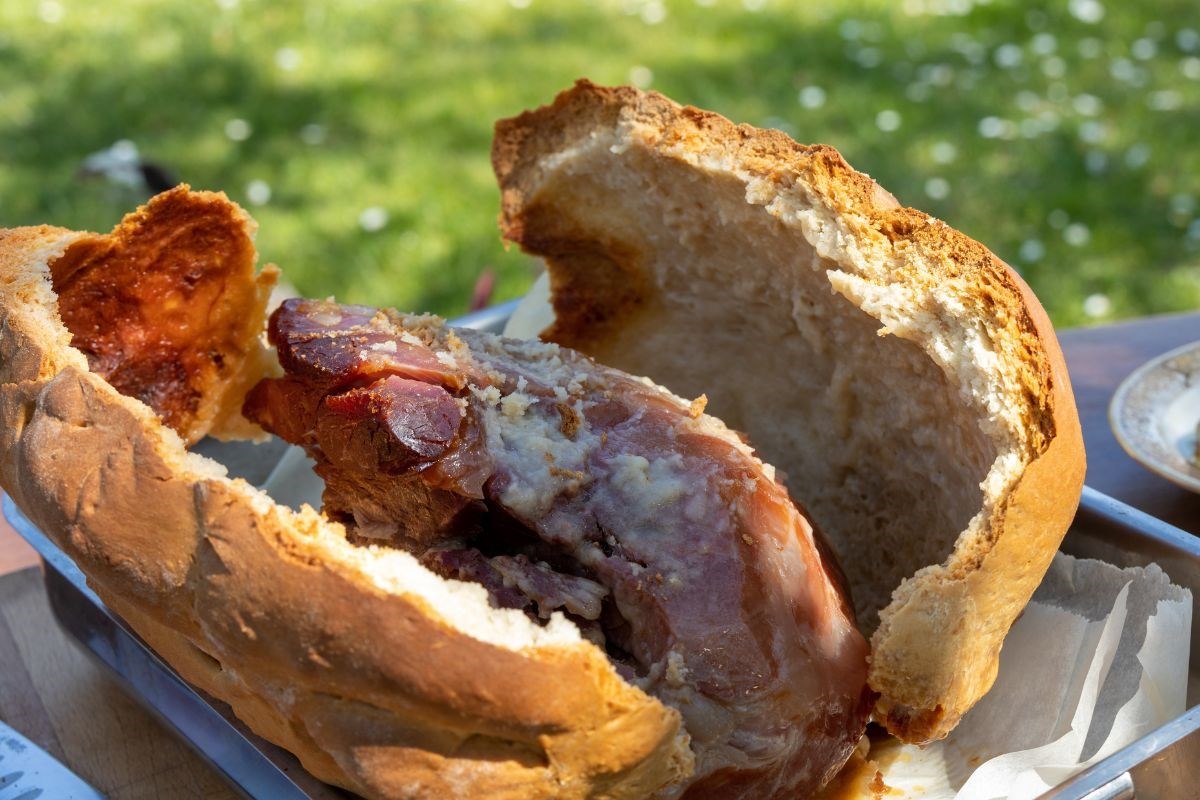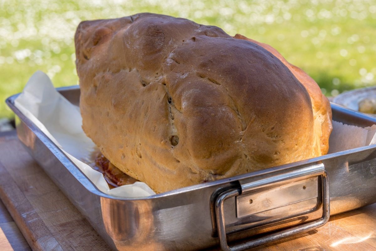 SASTOJCI: - 1kg šunke (dimljene) - 700g mekog brašna - 1 žličica soli - 200ml toplog mlijeka - 1 kvasac (svježi ili instant) - 1 žličica šećera - 50ml otopljenog maslaca - 200-300ml mlake vode