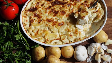 PRIPREMITE (ZA 6 OSOBA): ▶ 800 g krumpira ▶ 200 g crvenog luka ▶ 200 g svježeg sira ▶ 200 ml vrhnja za kuhanje ▶ 30 ml maslinova ulja ▶ 10 g soli ▶ 5 g papra